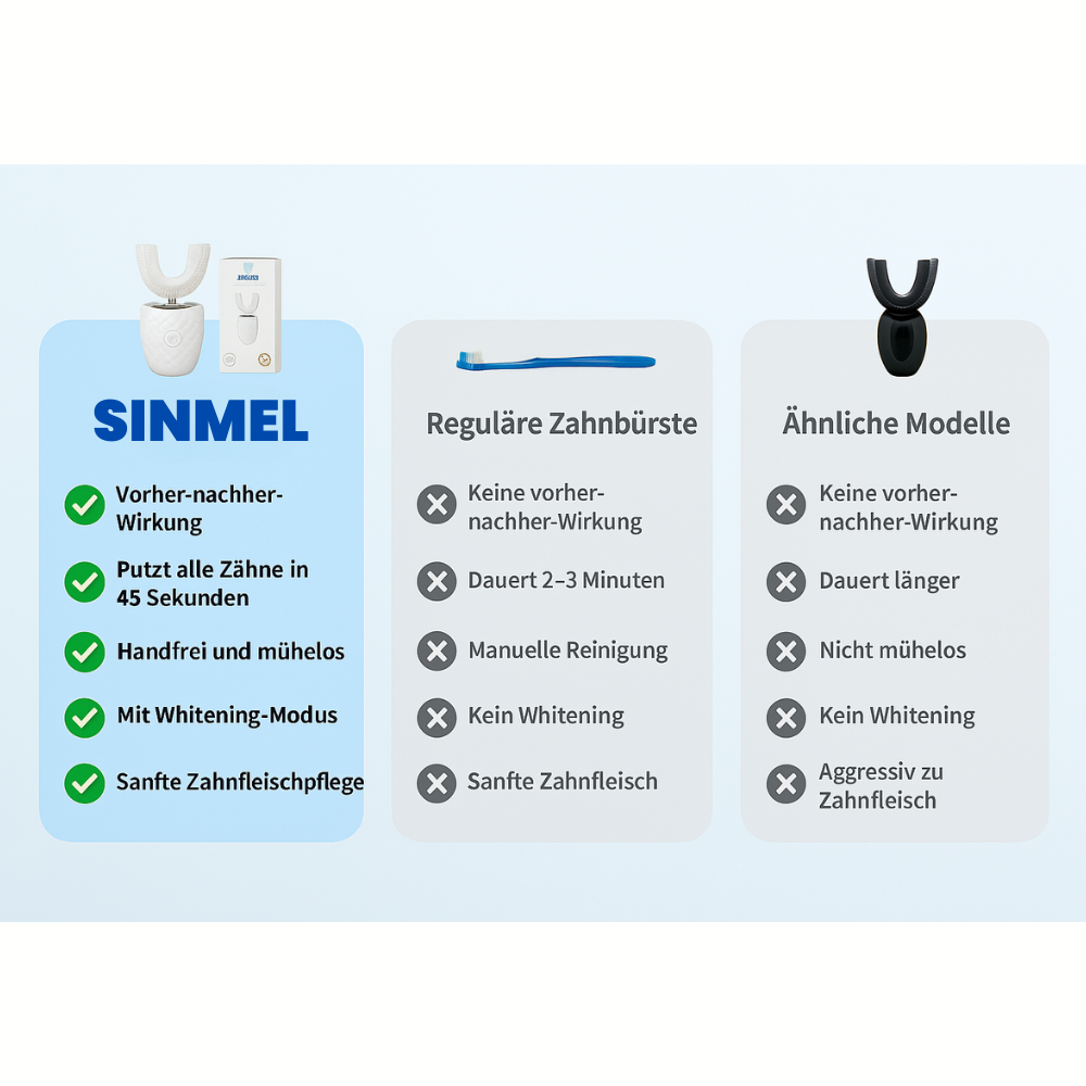 Mit einer schnelleren, schonenderen und effektiveren Reinigung setzt SinMel neue Standards in der Zahnpflege. Unser Vergleich zeigt klar, wo herkömmliche Bürsten und ähnliche Modelle zurückbleiben.